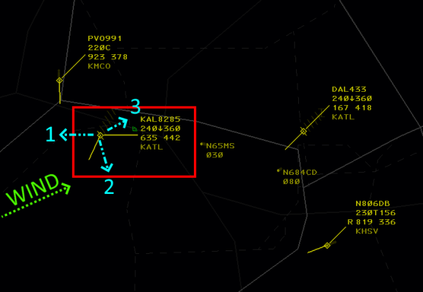 Let's say we need to vector KAL8285 for whatever reason (sequence, flow, metering, etc). Let's consider 3 (of many) choices for vectoring. The yellow PTL is located between the blue arrows 1 & 2. PTL is short for Projected Track Line. I prefer the term stinger, some people will call them bats. The name isn't important - all that matters is that its the current direction the plane is going and where they're expected to be in 1 minute (possible increments are 0,1,2,4,8). Note that the wind is coming from the southwest (typical of this region).